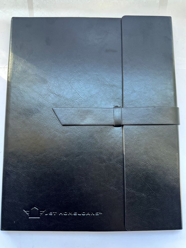 Vinyl portfolio with matching interior pen loop (pen not included), brown felt lining and a perfect bound 8 1/4" x 11" notebook containing 160 ivory lined pages (refillable)